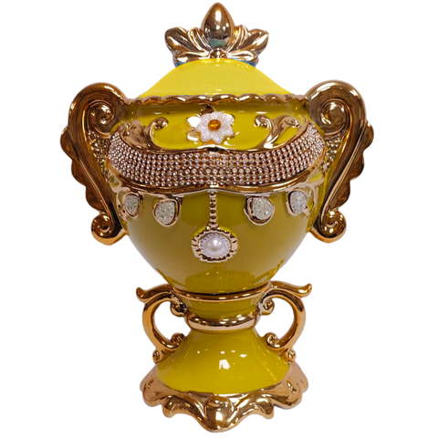 جرة سيراميك فاخرة صفراء وذهبية غطاء زهور من حجر الراين حاوية تخزين أنيقة ديكور منزلي إسبانية شعبية